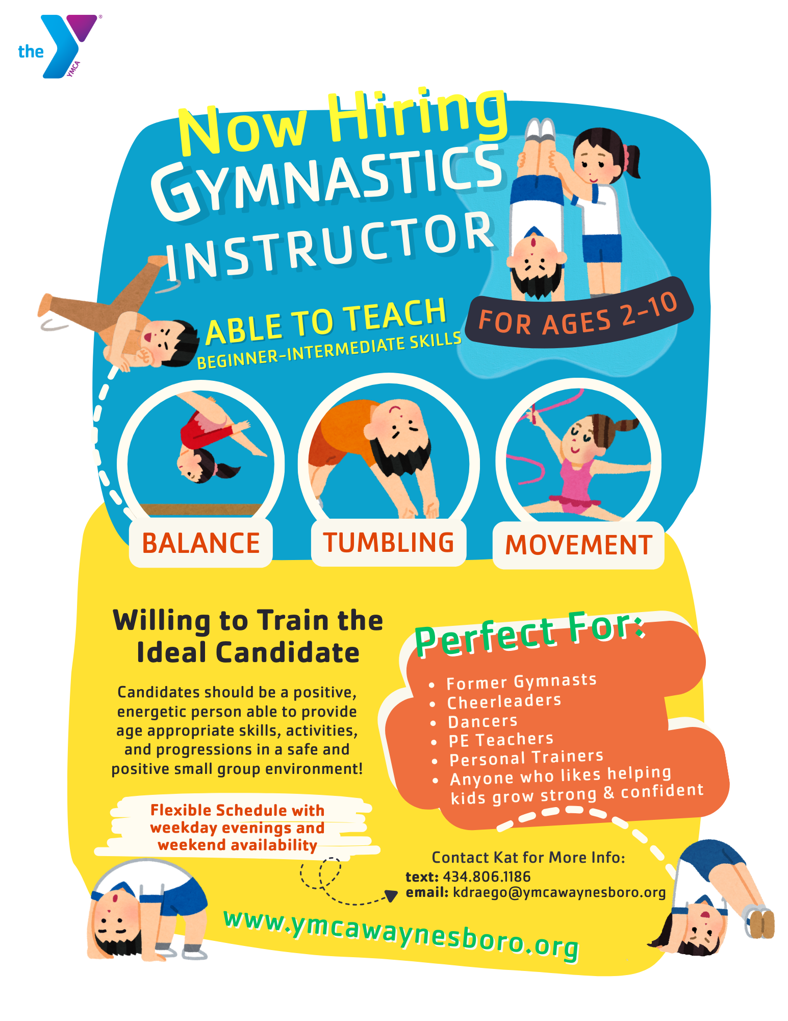 No experience necessary, willing to train and certify in house. Class fees will be refunded for participants dedicated to working at the Waynesboro Family YMCA.