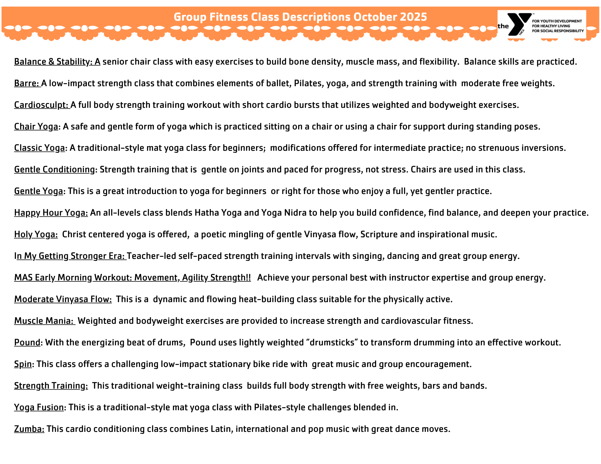 Cancellations for group fitness are posted on the Y’s Facebook page. We recommend you consult our Facebook page when possible before heading to class!