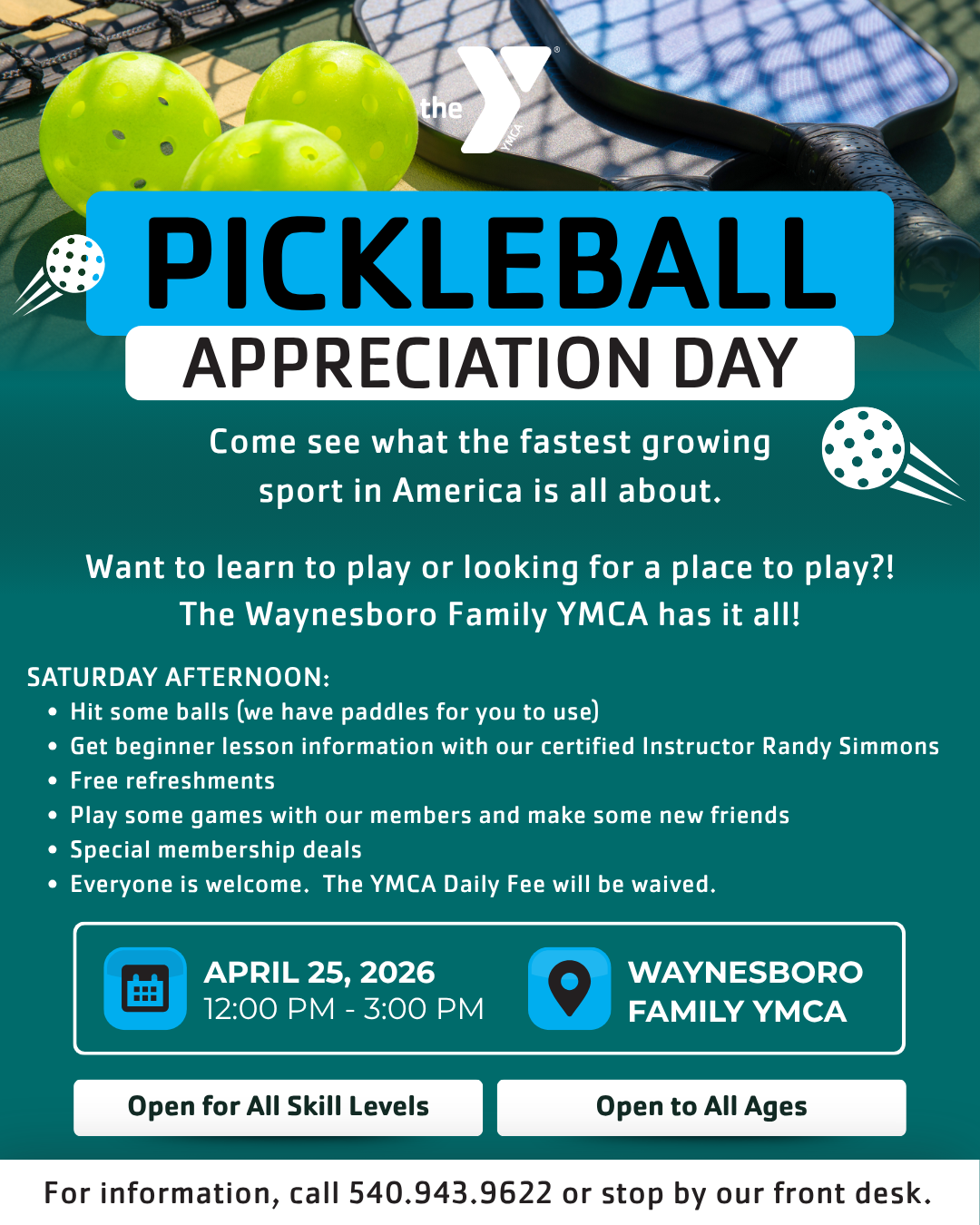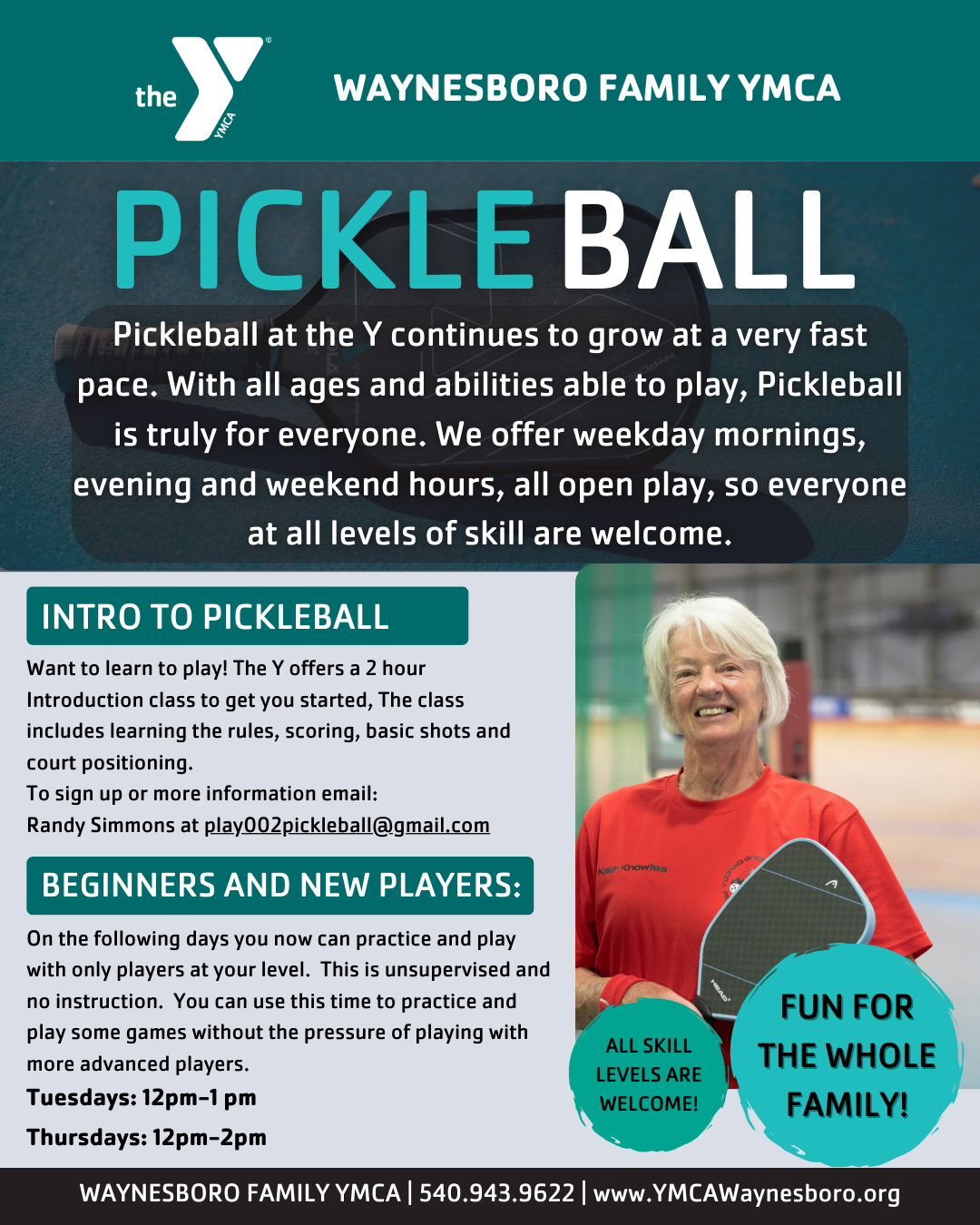 The Waynesboro Family YMCA offers drop-in open play pickleball hours for all members and non-members.